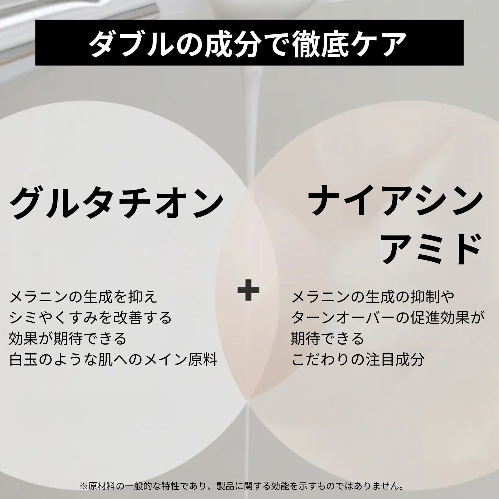 メラニンの生成を抑えシミやくすみを改善する効果のあるグルタチオンをたっぷり配合。さらに吸収の早い水溶性コラーゲンもプラスすることで、お肌に潤いもしっかりチャージ。毎日のケアで、ワントーン明るくみずみずしいふっくら美肌へと導いてくれます。さらにはナイアシンアミドも配合。グルタチオンとナイアシンアミドのW効果でより高い効果が期待できます。さらにビタミンEが豊富で保湿効果のあるブドウ種子オイル成分も配合。水溶性コラーゲンとのW効果で、透明感があって瑞々しく、弾力があってふっくらとしたもっちりツヤ肌に!シミ・そばかす・くすみなどが気になる方のホームケアにおすすめです。(内容量:70ml、成分:外箱に記載)