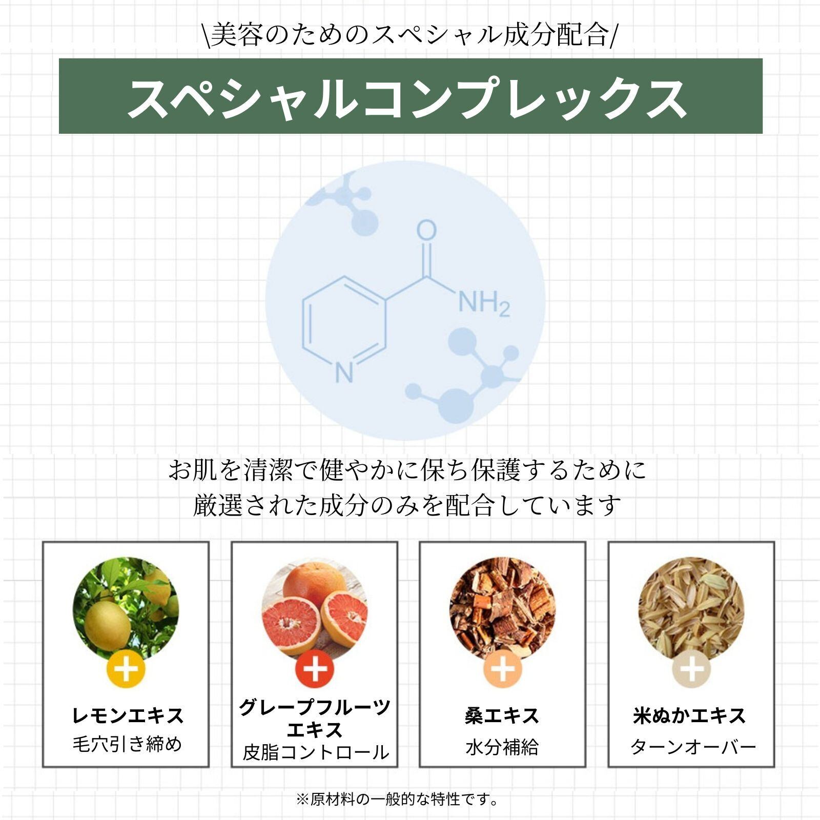 メラニンの生成を抑えシミやくすみを改善する効果のあるナイアシンアミドをたっぷり配合。毎日のケアでワントーン明るいお肌へと導いてくれます。 毛穴引き締め効果のあるレモンエキス、皮脂コントロール効果のあるグレープフルーツエキスもプラス。お肌の状態を整え、ビタミンパワーでより健康的で弾力のある明るいお肌へ。さらには、保湿効果のある桑エキス、ターンオーバー効果のある米ぬかエキスも配合。透明感があって瑞々しい、ふっくらとした自然なツヤ肌に!(内容量:100ml、成分:外箱に記載)