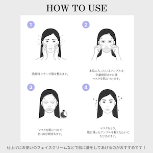 洗顔後、化粧水で軽く整えた後、マスクを取り出し肌に貼り付けます。15-20分程度そのまま待ちます。マスクを剥がし、肌に残ったアンプルを手で軽く抑えて馴染ませます。その後、フェイスクリームなどでスキンケアの仕上げを行なってください。