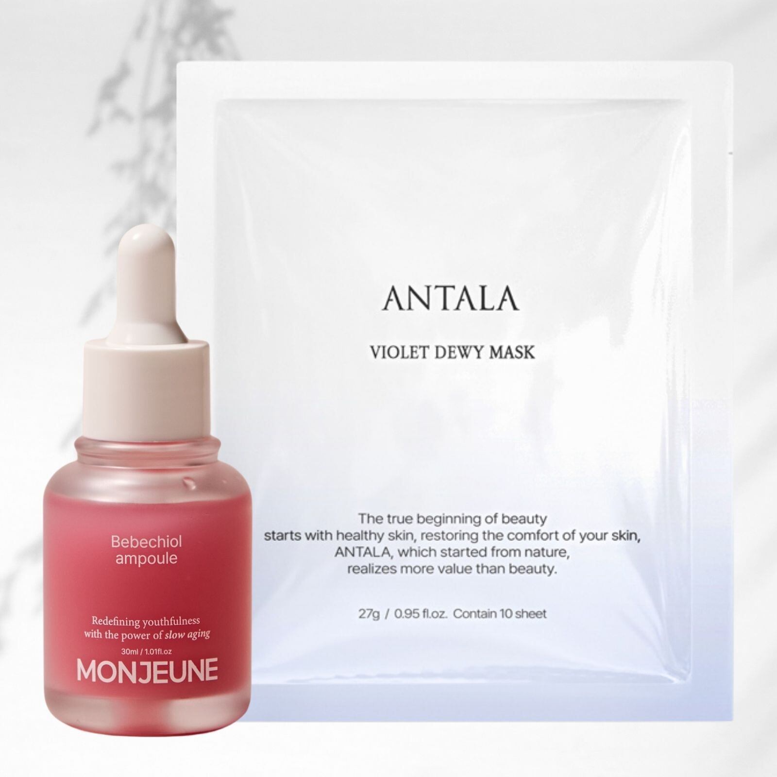 韓国の有名スキンケアブランド『ANTALA』の人気商品「ヴァイオレット ツヤ肌集中マスク」と「モンジュン ベベチオール美容液」のお得なスキンケアセット。ギフトやプレゼントにもおすすめです♪