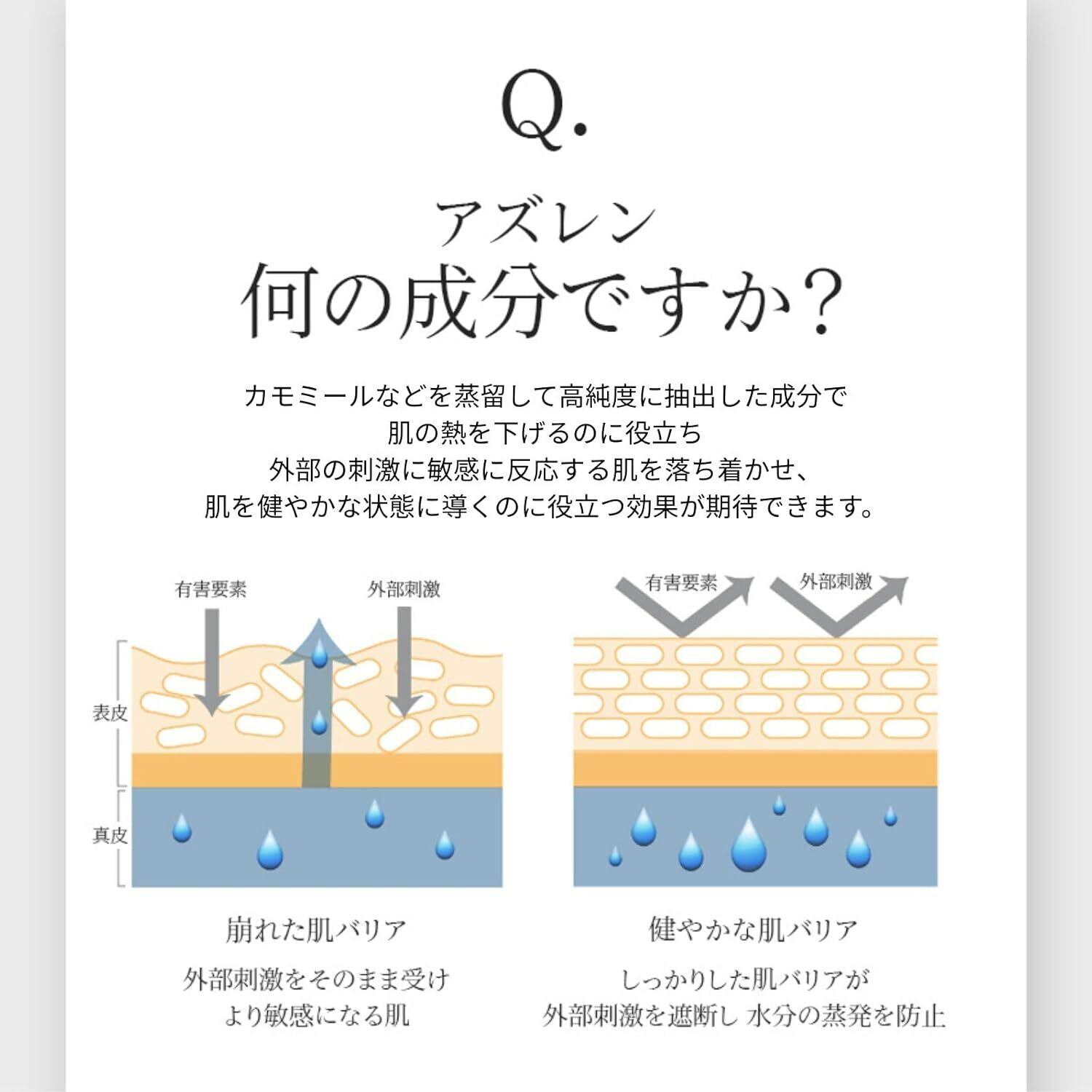 ①鎮静効果があり、肌トラブルを落ち着かせ、肌を健やかな状態に導くのに役立つ「アズレン」を丁寧に抽出し、そのエキスをたっぷり贅沢に詰め込みました。
