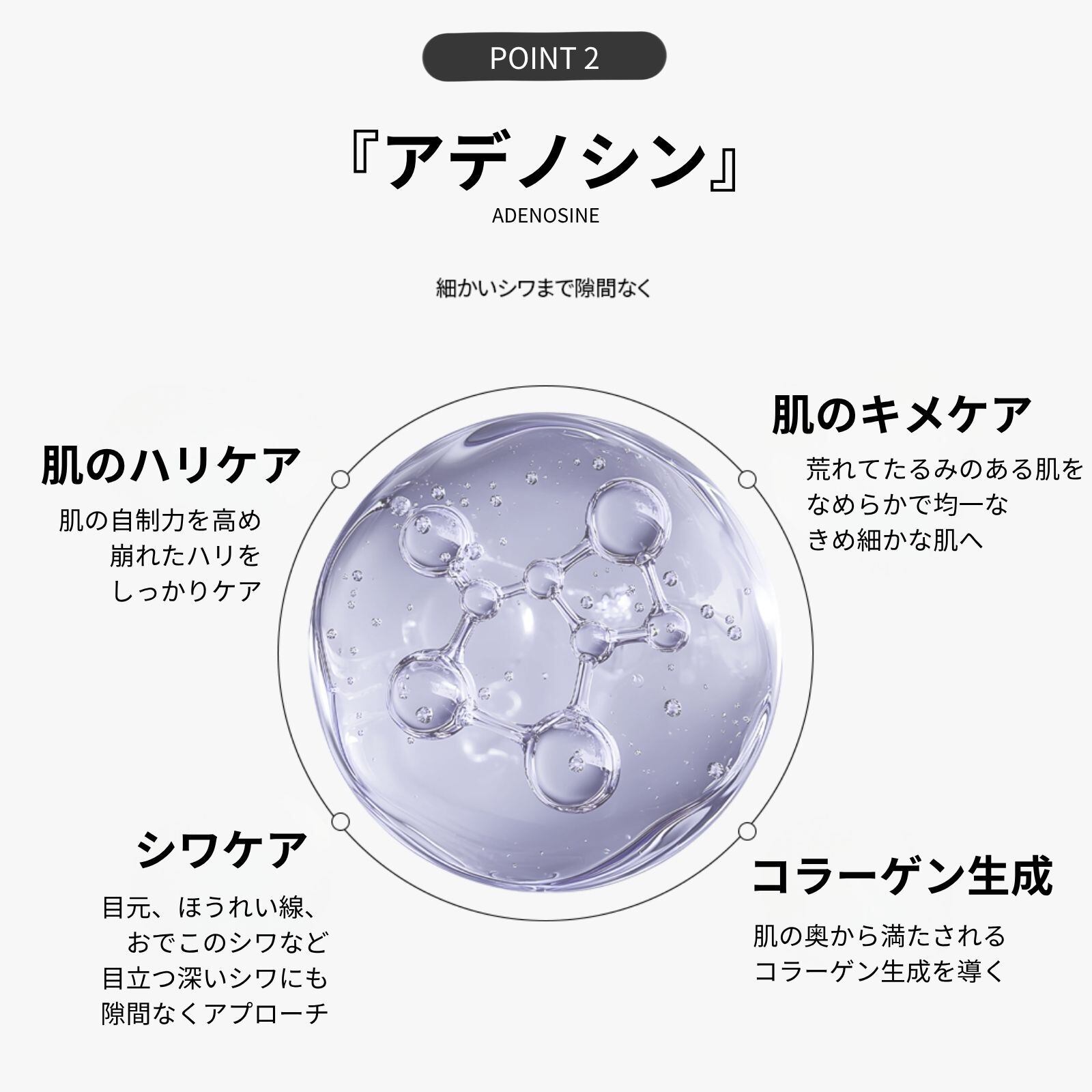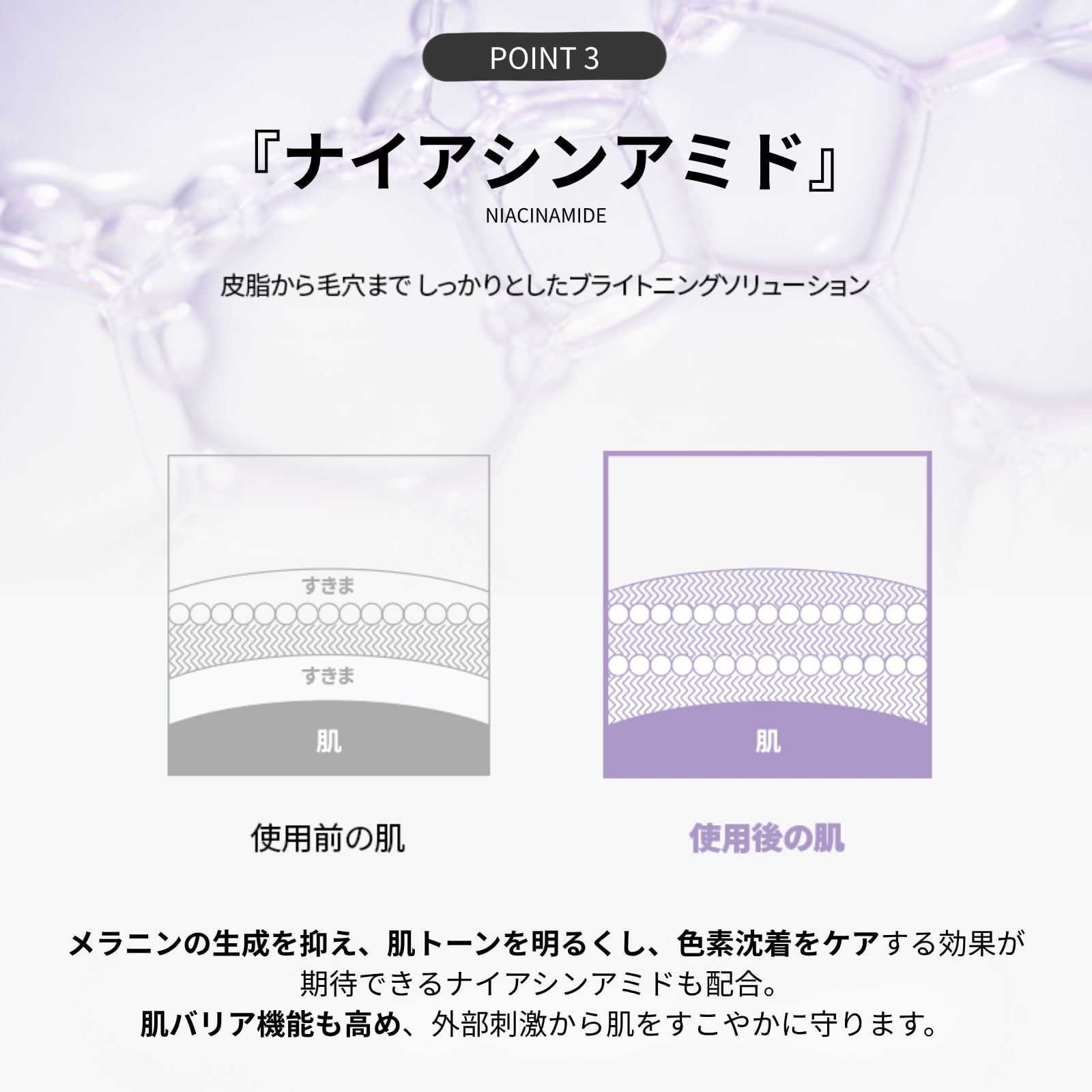 ②メラニンの生成を抑えシミやくすみを改善する効果が期待できる「ナイアシンアミド」と、肌のハリやシワなどへの効果が期待できる「アデノシン」も配合。毎日のケアでワントーン明るくハリのある美肌へ。