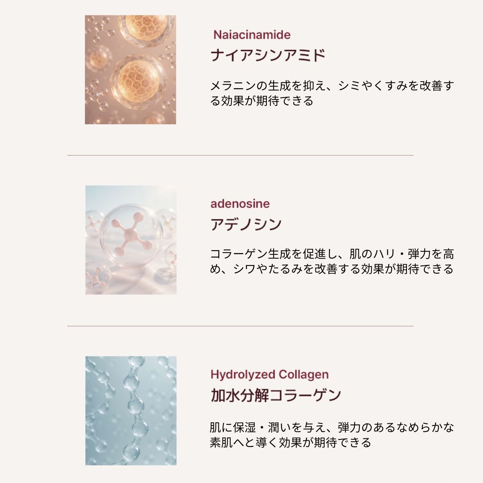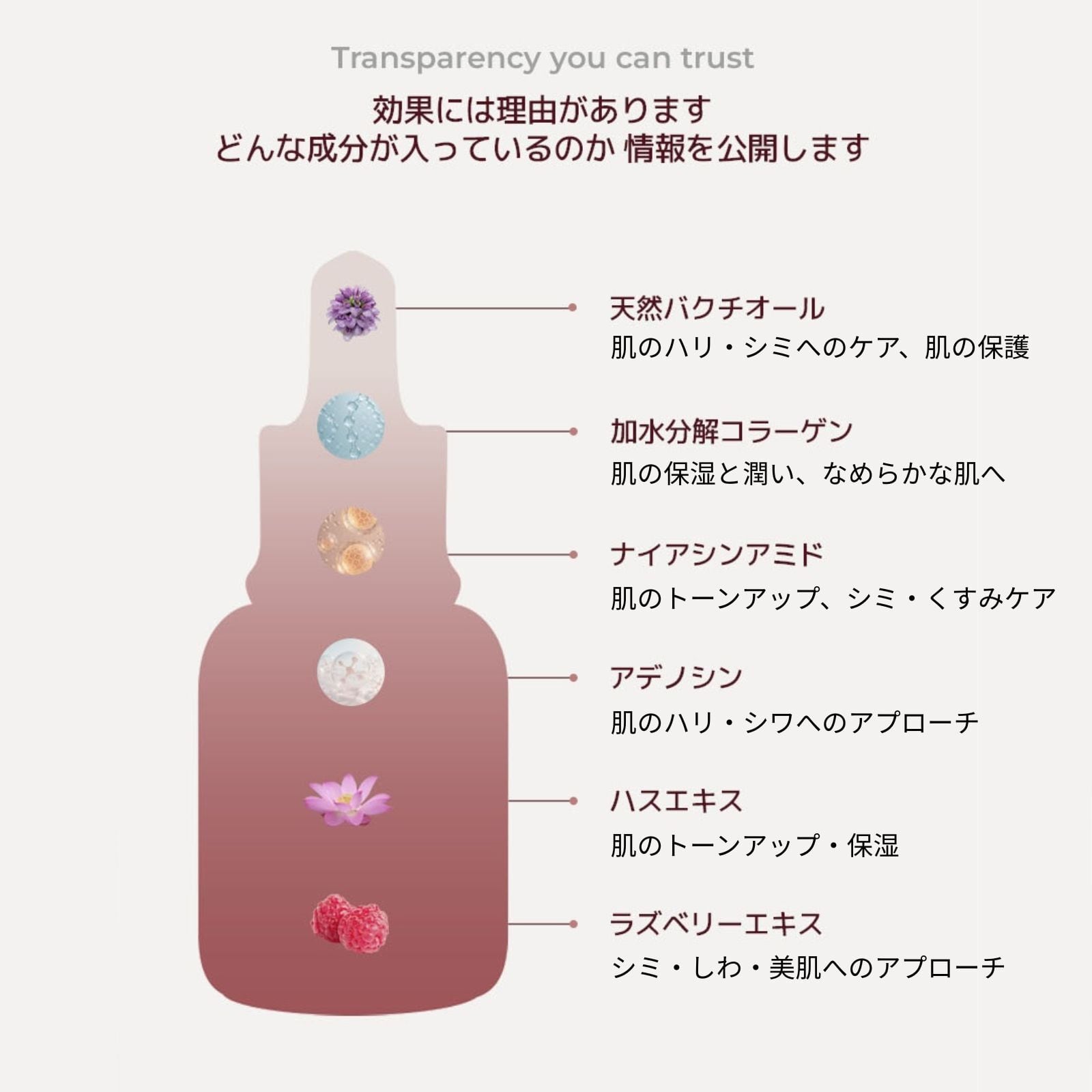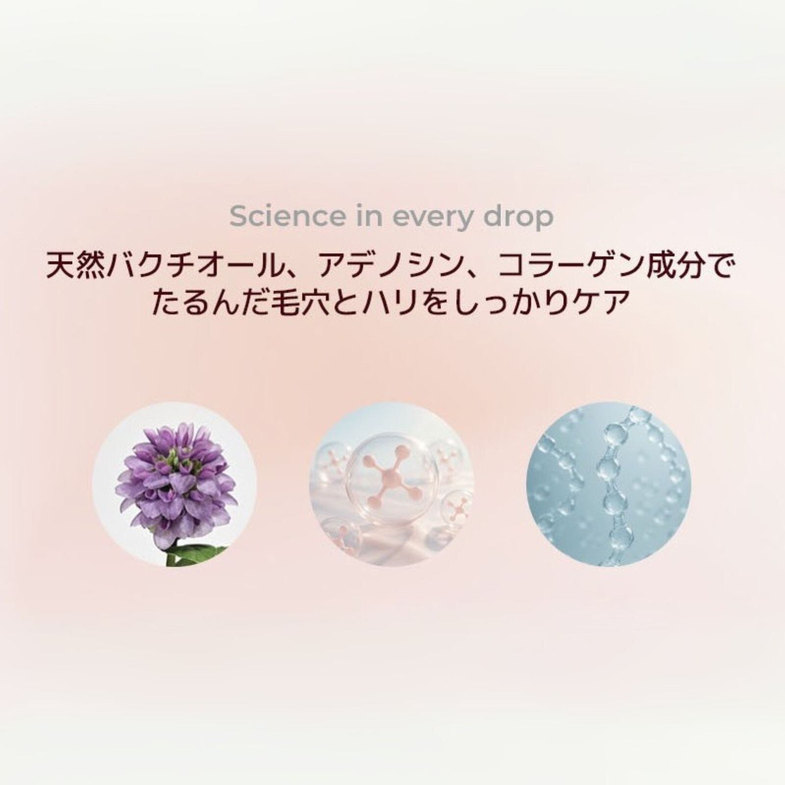 さらには、肌の弾力・しわなどへの効果が期待できる天然バクチオールやアデノシン、保湿・潤い効果が期待できる加水分解コラーゲンなどもプラス。美肌へと導く栄養成分が豊富に含まれた贅沢な1本に仕上がっています♪