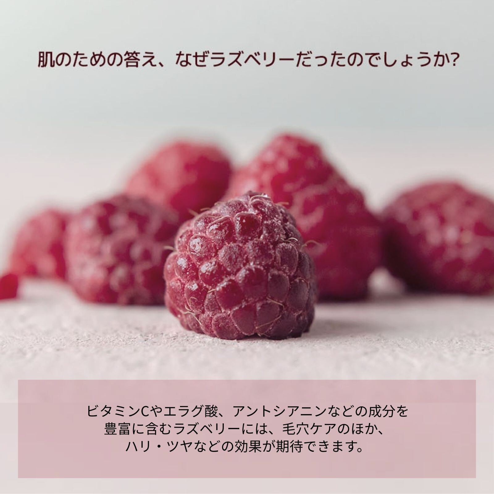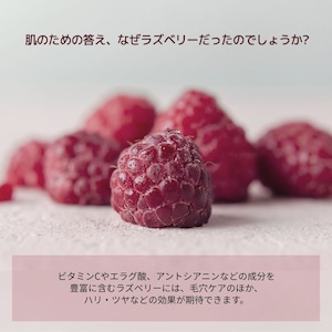 新鮮なラズベリーをたっぷりと使用。ビタミンC・アントシアニン・ポリフェノールなどの栄養成分が豊富に含まれ、肌の弾力や保湿・シワケアなどの美肌効果が期待できるラズベリーパワーをギュギュッと贅沢に詰め込みました。使うほどにハリ感のあるのふっくら健康肌へと導いてくれます♪