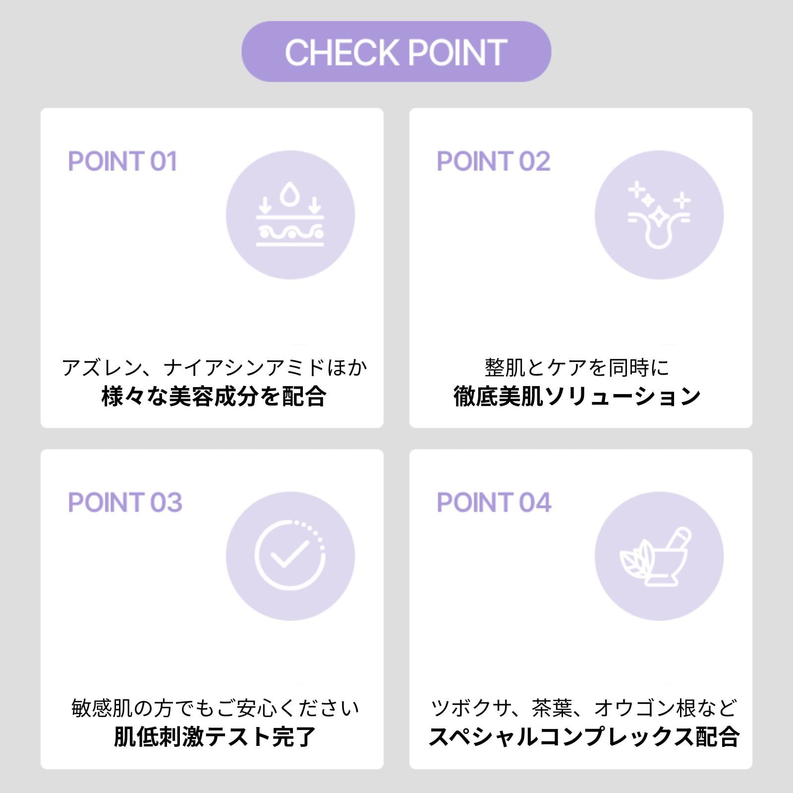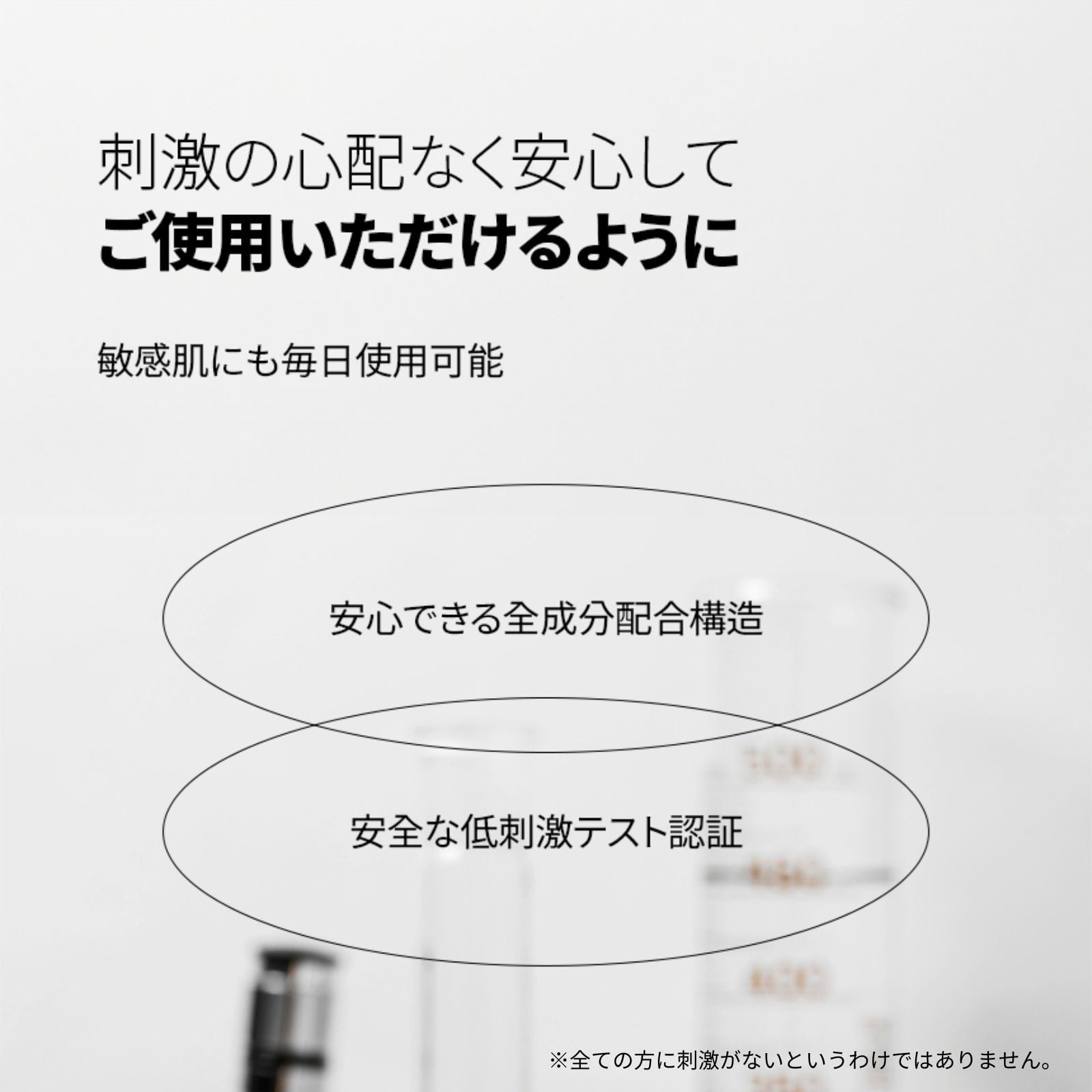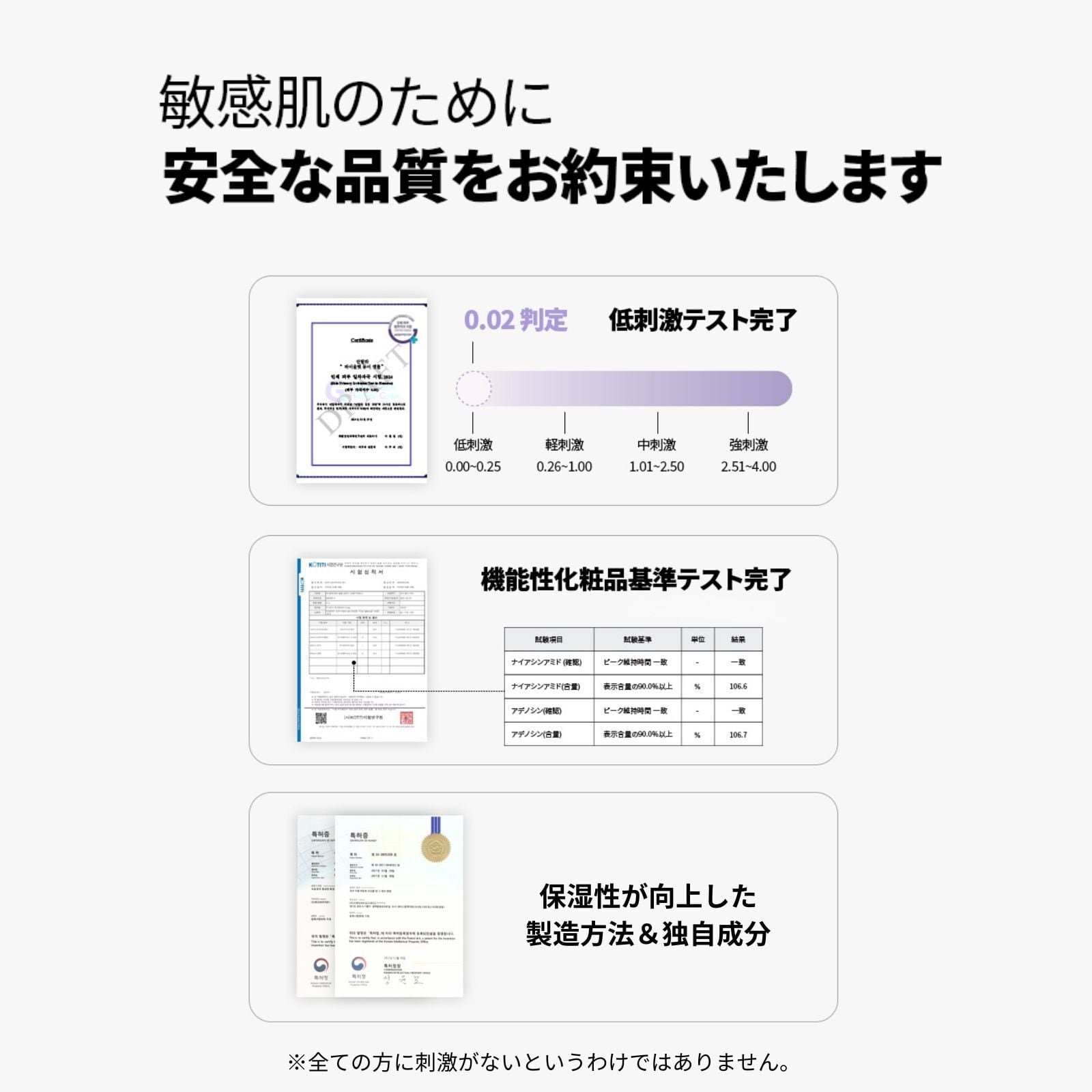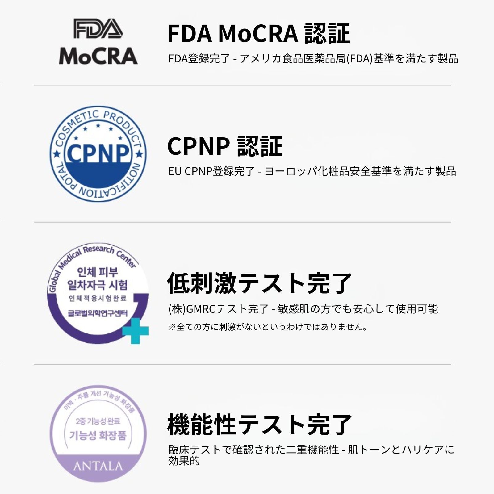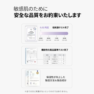 敏感肌や肌トラブルにお悩みの方にもお使いいただけるよう、お肌に優しい逸品に仕上げました。(FDA MoCRA認証、CPNP認証、低刺激テスト完了)