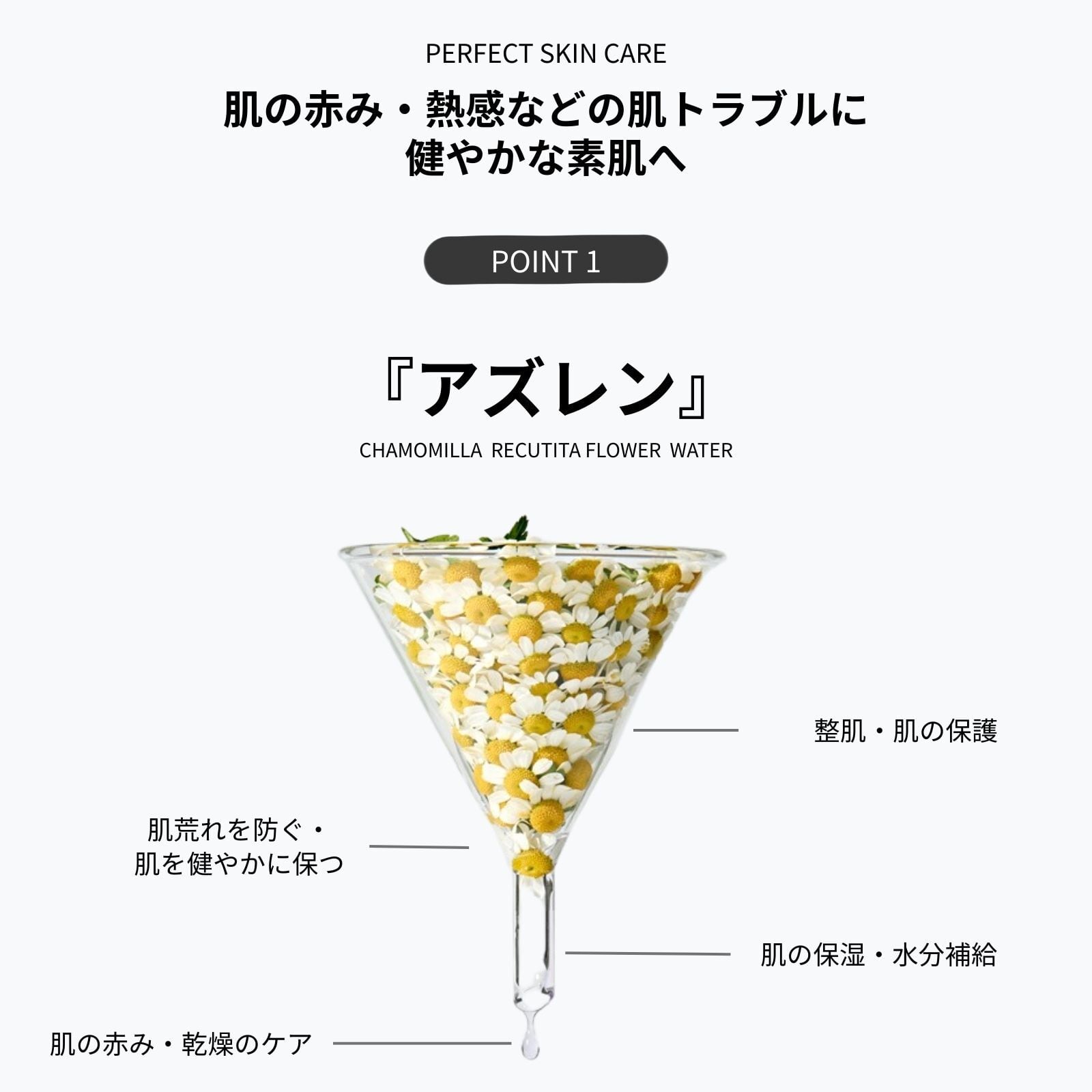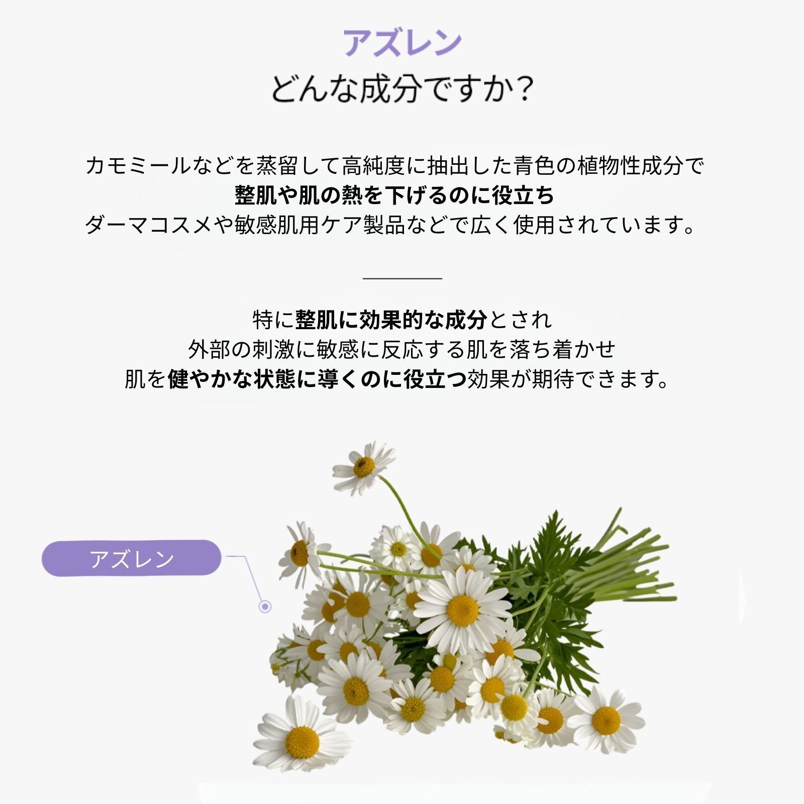 カモミールなどの植物に含まれる成分「アズレン」。鎮静効果があり、肌トラブルを落ち着かせ、肌を健やかな状態に導くのに役立つアズレンのパワーに着目し、丁寧に抽出したエキスをたっぷり贅沢に詰め込みました。敏感肌や乱れたお肌にお悩みの方におすすめの逸品です。