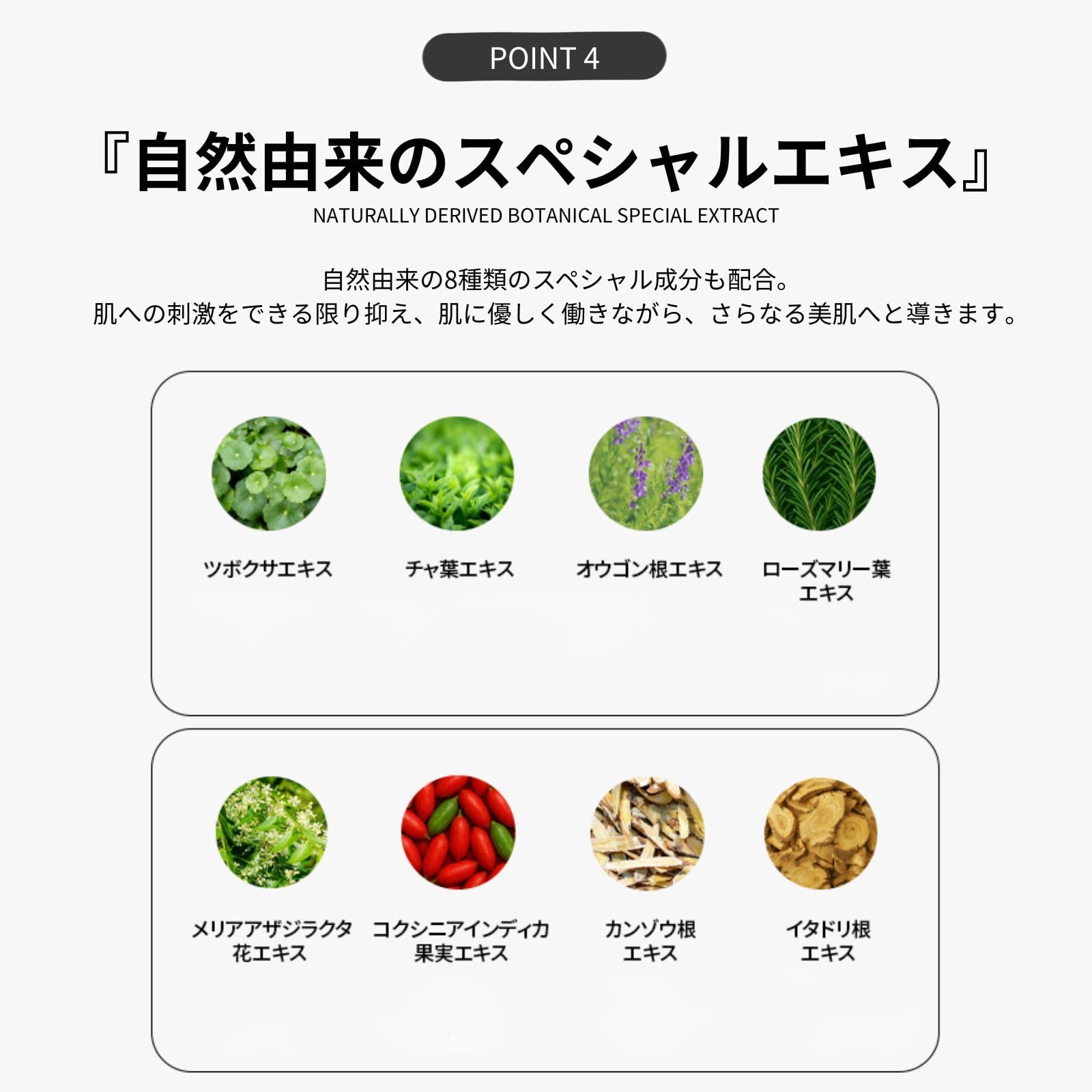 さらには、CICA(シカ:ツボクサエキス)やチャ葉、オウゴン根、イタドリ根などの自然由来の8種類のスペシャル成分も配合。肌への刺激をできる限り抑え、肌に優しく働きながら、内から潤い輝く真の美肌へと導きます。厳選した栄養成分をギュギュギュと詰め込んだ贅沢すぎる1本に仕上がっています。