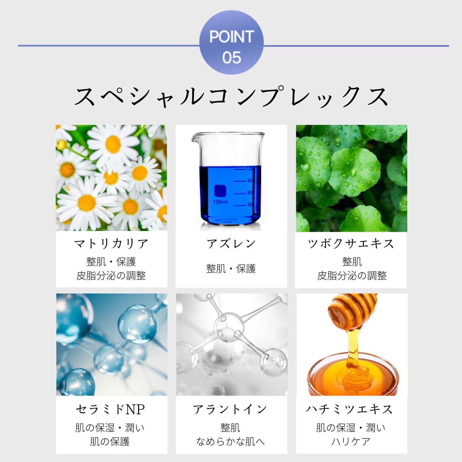 カモミールなどの植物に含まれる成分「アズレン」。鎮静効果があり、肌トラブルを落ち着かせ、肌を健やかな状態に導くのに役立つアズレンのパワーに着目し、丁寧に抽出したエキスをたっぷり贅沢に詰め込みました。ニキビや敏感肌・乱れたお肌にお悩みの方におすすめの逸品です♪