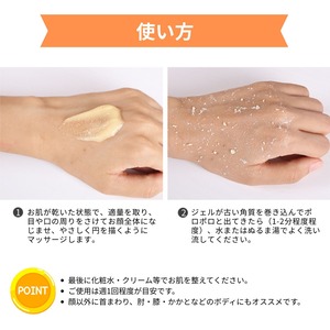 お肌が乾いた状態で、適量を取り、目や口の周りをさけてお顔全体になじませ、やさしく円を描くようにマッサージします。 ジェルが古い角質を巻き込んでポロポロと出てきたら(1-2分程度程度)、水またはぬるま湯でよく洗い流してください。その後、化粧水・クリーム等でお肌を整えてください。ご使用は週1回程度が目安です。必ずお肌が乾いた状態でお使いください。顔以外に首まわり、肘・膝・かかとなどのボディにもお使いいただくと効果的です♪