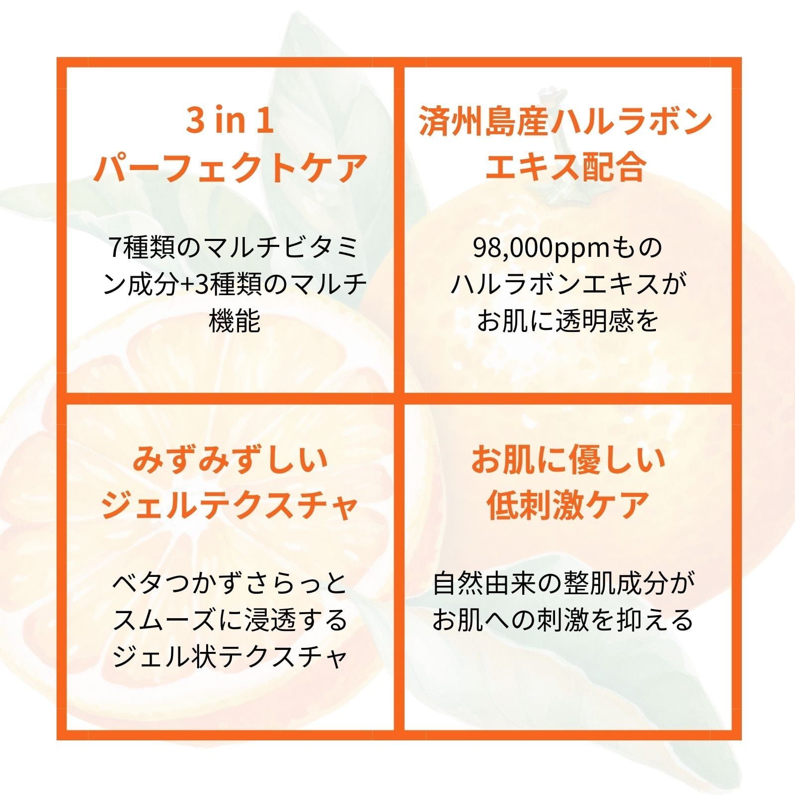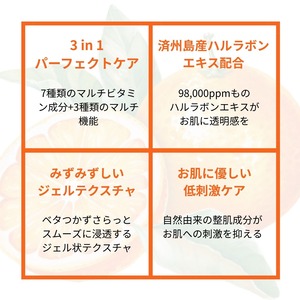 一般のオレンジに比べ約1.5倍ものビタミンCを含む、韓国済州島(チェジュ島)原産のハルラボンという柑橘を贅沢に使用。たっぷりのビタミン類を含むハルラボンエキスが健康的で明るいお肌へと導いてくれます♪