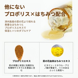 韓国済州島(チェジュ島)原産の菜の花より取れる貴重な蜂蜜を贅沢に使用。ビタミン・ミネラル・アミノ酸などがたっぷり含まれ、保湿と潤い効果が期待できるはちみつパワーをギュギュッと贅沢に詰め込みました。使うほどにモチモチ感のあるのふっくら美肌感へと導いてくれます♪
