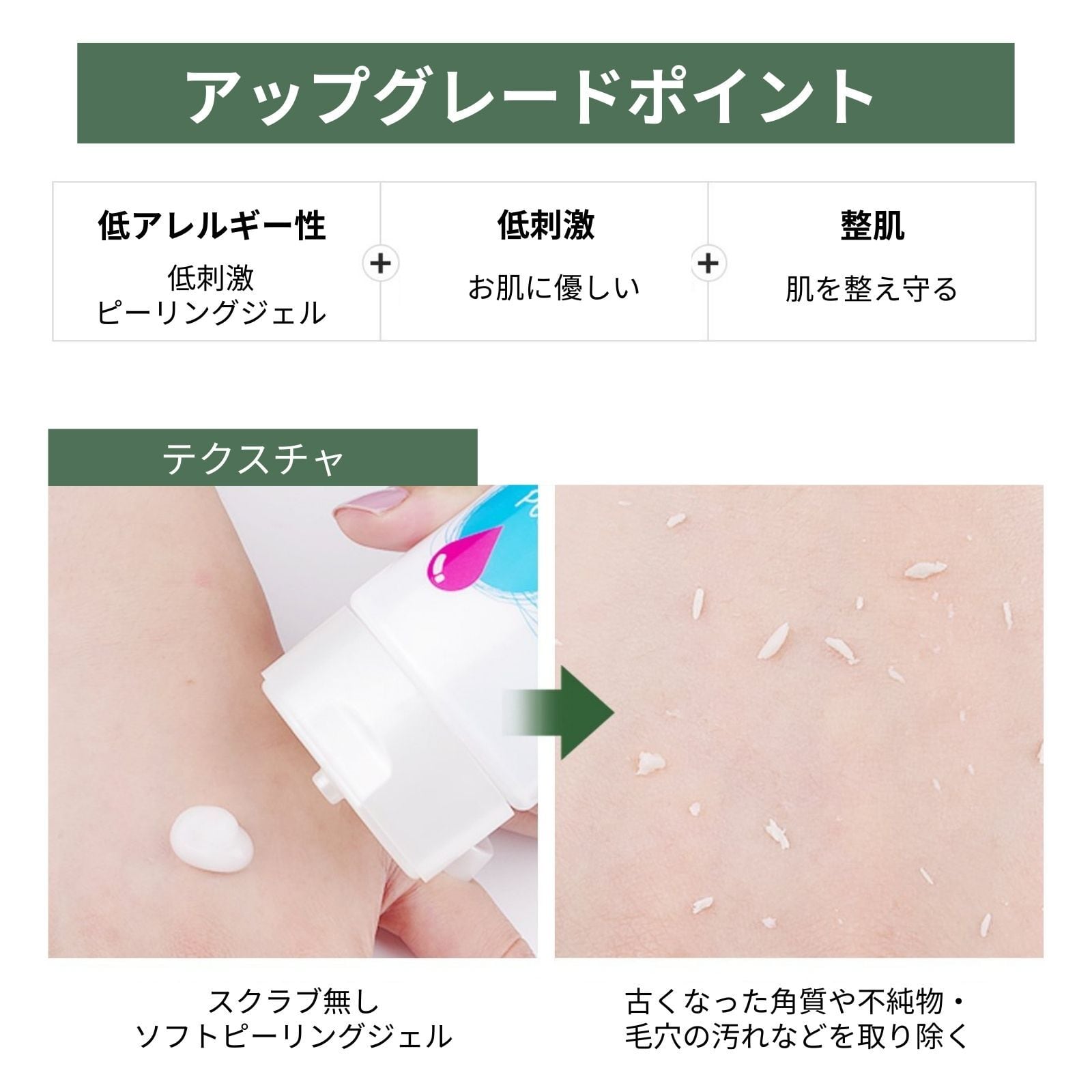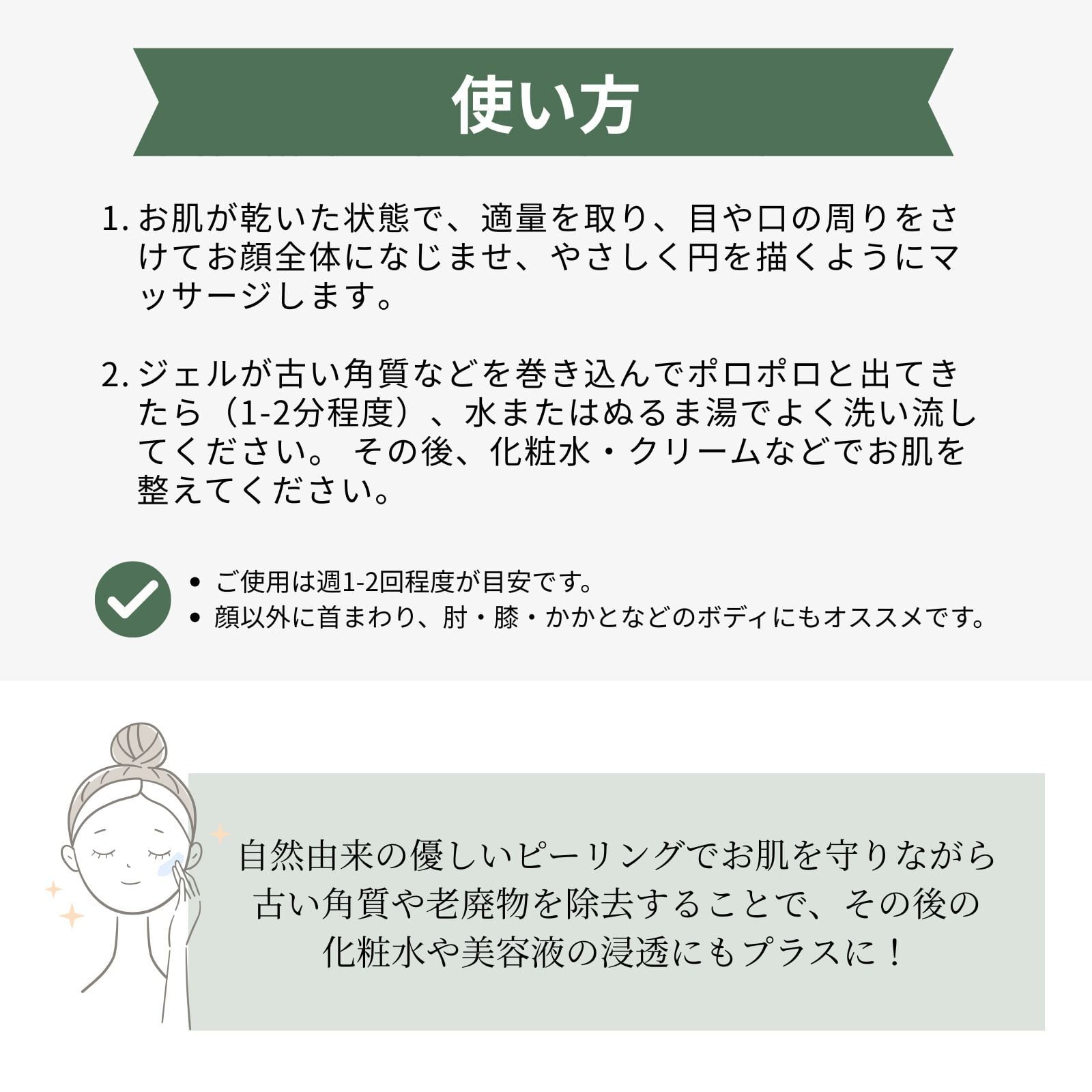 お肌が乾いた状態で、適量を取り、目や口の周りをさけてお顔全体になじませ、やさしく円を描くようにマッサージします。 ジェルが古い角質を巻き込んでポロポロと出てきたら(1-2分程度程度)、水またはぬるま湯でよく洗い流してください。その後、化粧水・クリーム等でお肌を整えてください。ご使用は週1-2回程度が目安です。必ずお肌が乾いた状態でお使いください。顔以外に首まわり、肘・膝・かかとなどのボディにもお使いいただくと効果的です♪