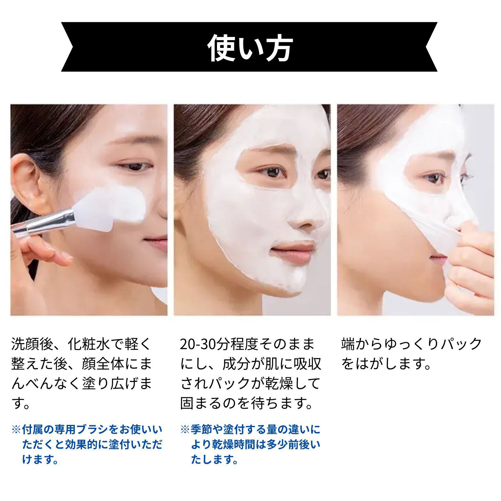 洗顔後、化粧水で軽く整えた後、顔全体にまんべんなく塗り広げます(付属の専用ブラシをお使いください)。20-30分程度そのままにし、成分が肌に吸収されパックが固まるのを待ちます。端からゆっくりパックをはがします。