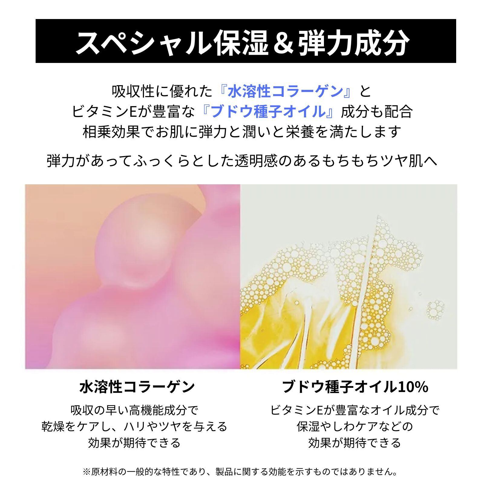 さらには、ビタミンEが豊富で保湿効果のあるブドウ種子オイル成分も配合。水溶性コラーゲンとのW効果で、透明感があって瑞々しく、弾力があってふっくらとしたもっちりツヤ肌に!