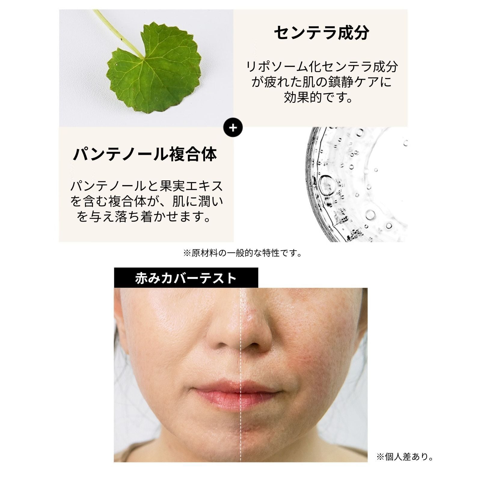 センテラ成分とパンテノール複合体の鎮静&保湿レイヤー配合で、肌荒れや炎症をやさしくケアしながら、乾燥した肌に潤いを与えてくれます。
